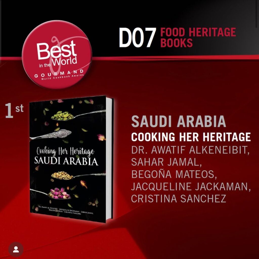 Un libro de cocina centrado en comidas tradicionales titulado “Cocinando su herencia, Arabia Saudita” realizado por cinco coautoras tiene la participaciòn de Jacqueline Jackaman quien participo de este festival y ademas fue galardonada.